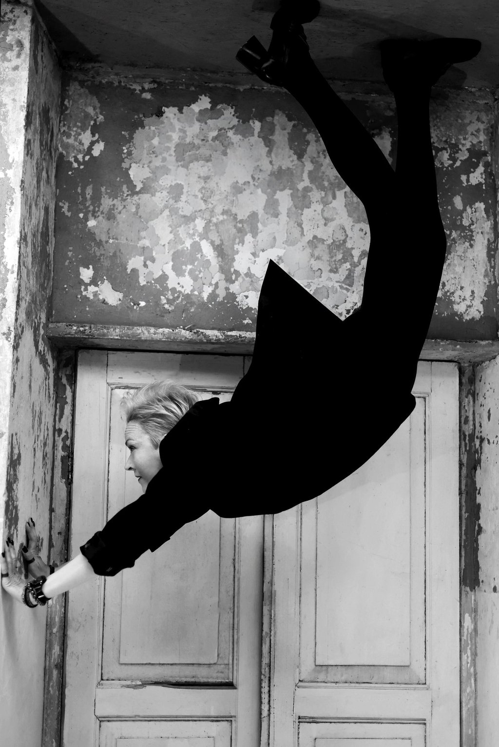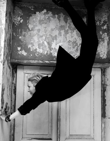 A woman hovers in the air, neither falling nor yielding to gravity—she chooses to rise. Her posture and gestures reveal willpower and control, often associated with masculinity, yet expressed through a feminine body and form.