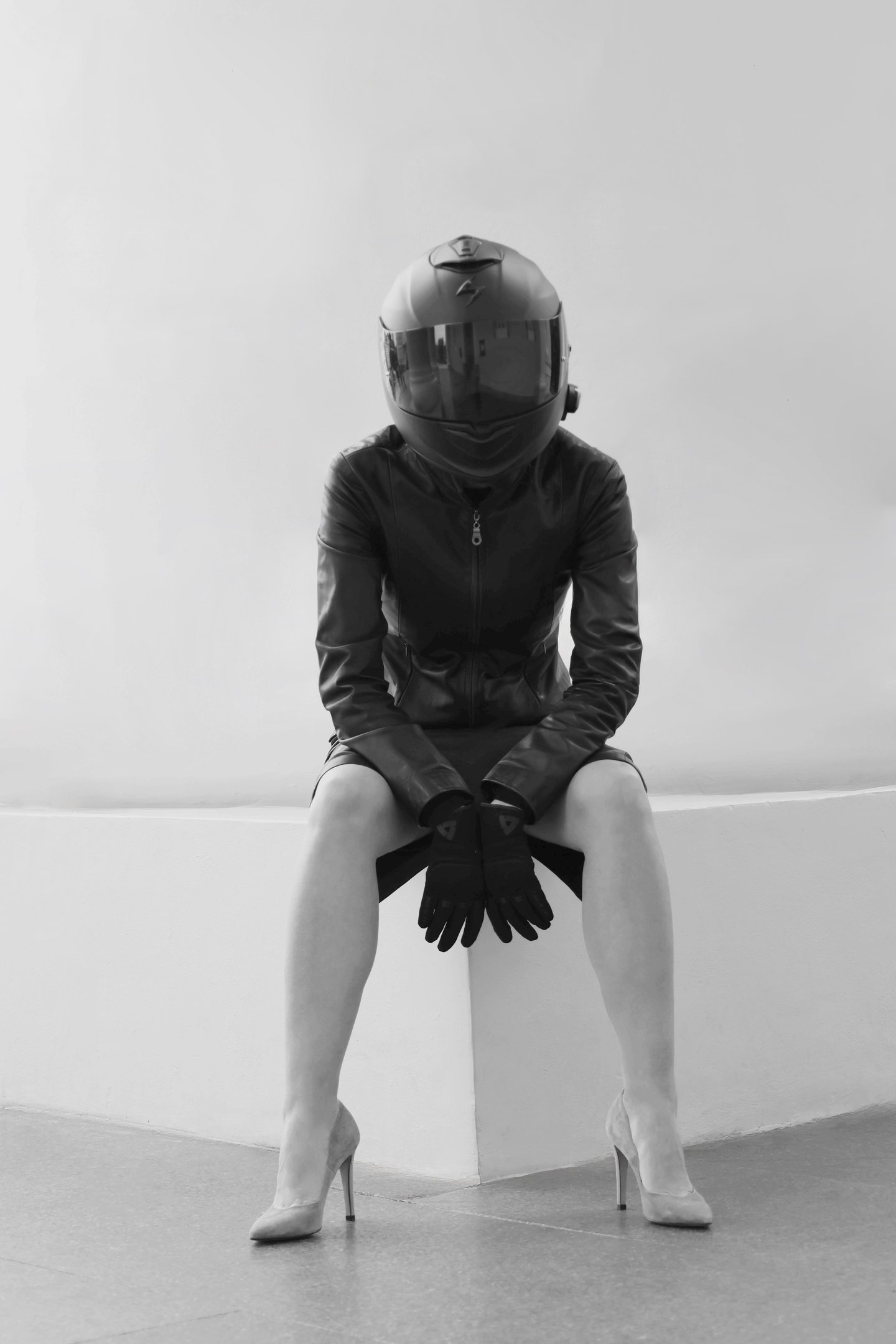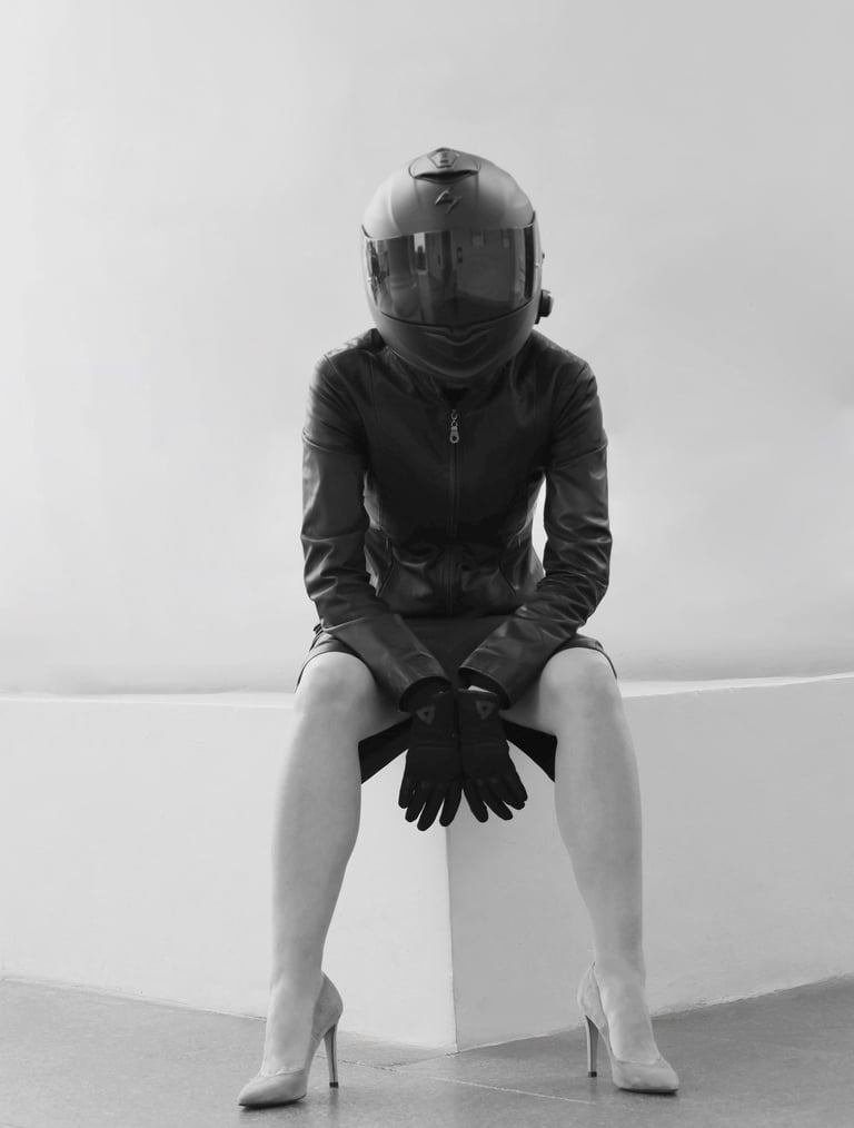 Perfekcionizmas – griežta tvarka, kontrolė ir nepriekaištingos detalės – juodoje odinėje striukėje sėdinti moteris pasitikinti idealiai baltame fone.