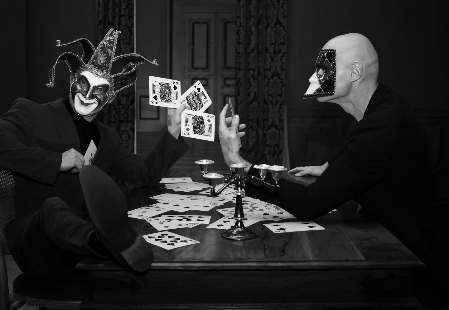 The Bauta’s unreadable authority faces the Joker’s chaotic impulsiveness across a table, revealing the tension between outward control and inner turmoil.