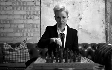 Suit. Tie. Short platinum hair. Eyes already twelve moves ahead. She places her piece with the calm certainty of someone who has always known she belongs here.