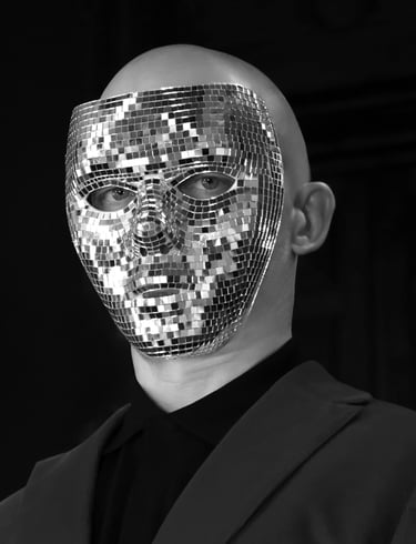 A thousand tiny mirrors cover the face, leaving only the eyes—watching, human, present. The mask reflects everything, revealing nothing of itself.