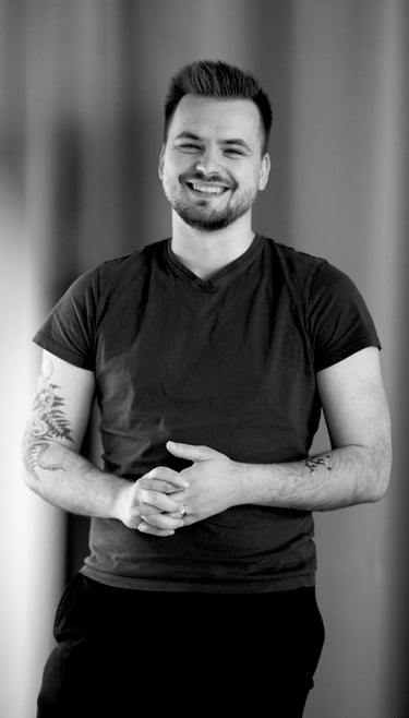 EN: Duo- Mr. Inner Potential & Mrs. Mona Lisa. Photo of the young man with a genuine smile, grounded stance, and interlaced hands radiates ease, warmth, and power. Nearby, a young woman in near-total black with Rembrandt lighting hints at hidden depth. Together, they embody the two universal archetypes of psychological portraiture: the open and the hidden.