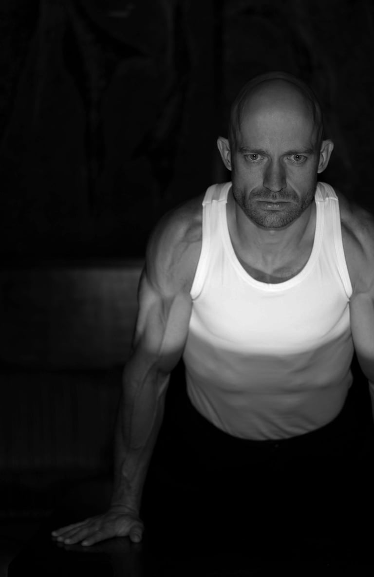 EN: Inner portrait. Tensed muscles and a dramatic gaze against a dark background reveal an inner portrait of struggle and unyielding resistance.